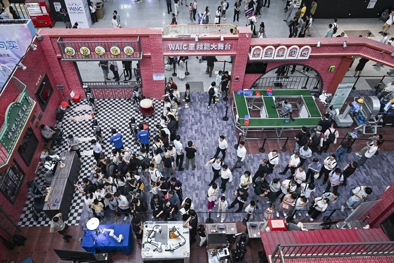 這是7月29日拍攝的“WAIC里技能大舞臺(tái)”,多款機(jī)器人在此進(jìn)行技能展示。