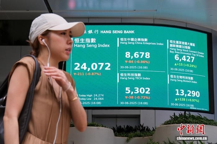 7月29日,香港交易及結(jié)算所有限公司表示,今年上半年,其全資附屬公司香港聯(lián)合交易所有限公司平均每日成交金額達(dá)2402億港元,同比增長(zhǎng)118%。圖為6月30日,2025年上半年最后一個(gè)交易日,香港恒生指數(shù)收市報(bào)24072.28點(diǎn)。(資料圖) 中新社記者 陳永諾 攝