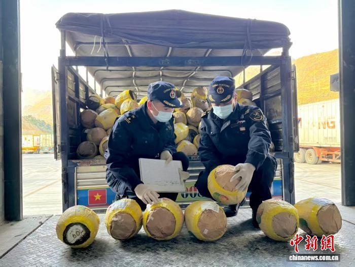 海關(guān)關(guān)員在天保口岸對(duì)進(jìn)口越南菠蘿蜜進(jìn)行查驗(yàn)。萬(wàn)應(yīng)超 攝