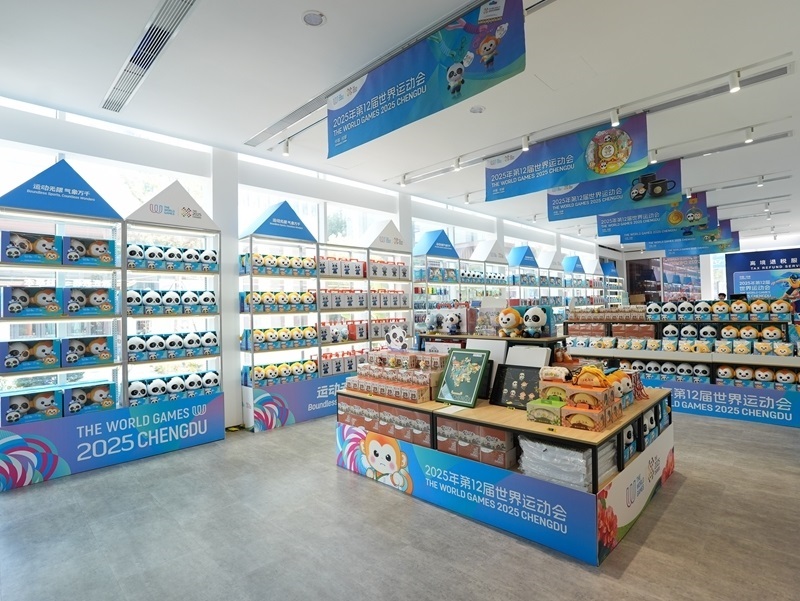 這是8月3日在成都世運(yùn)會(huì)運(yùn)動(dòng)員村A區(qū)拍攝的官方特許商品零售店內(nèi)的紀(jì)念品。