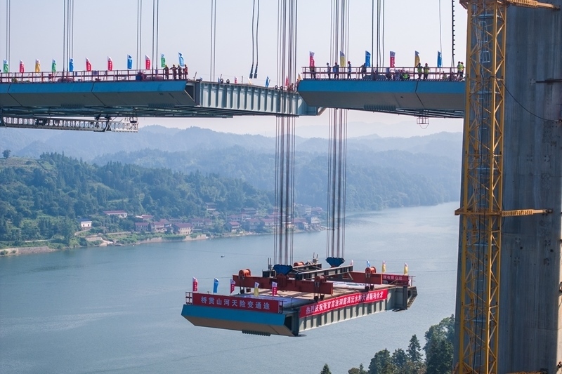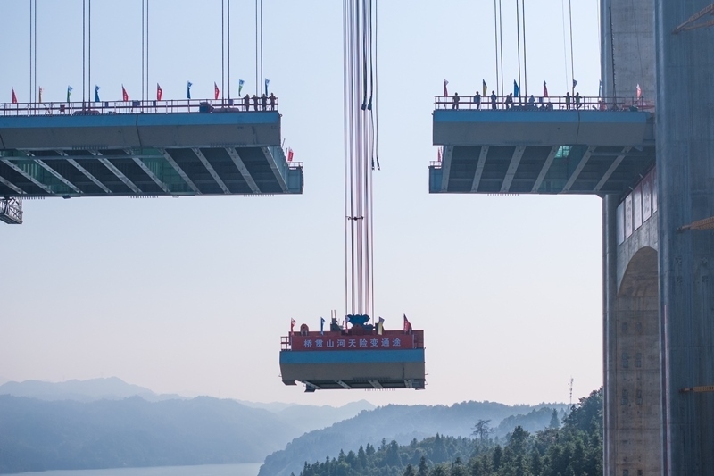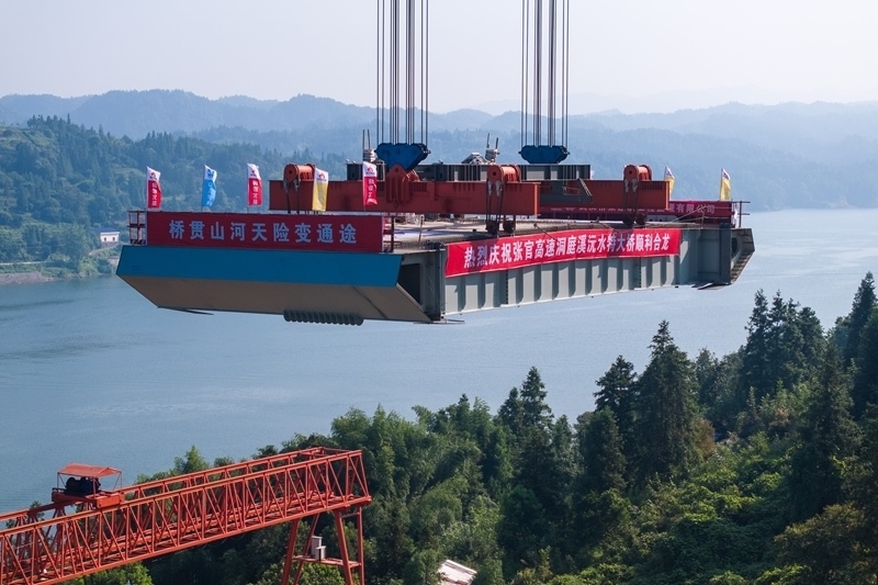 8月3日,在張官高速洞庭溪沅水特大橋施工現(xiàn)場,一塊鋼混結(jié)合梁在被緩緩提升(無人機照片)。