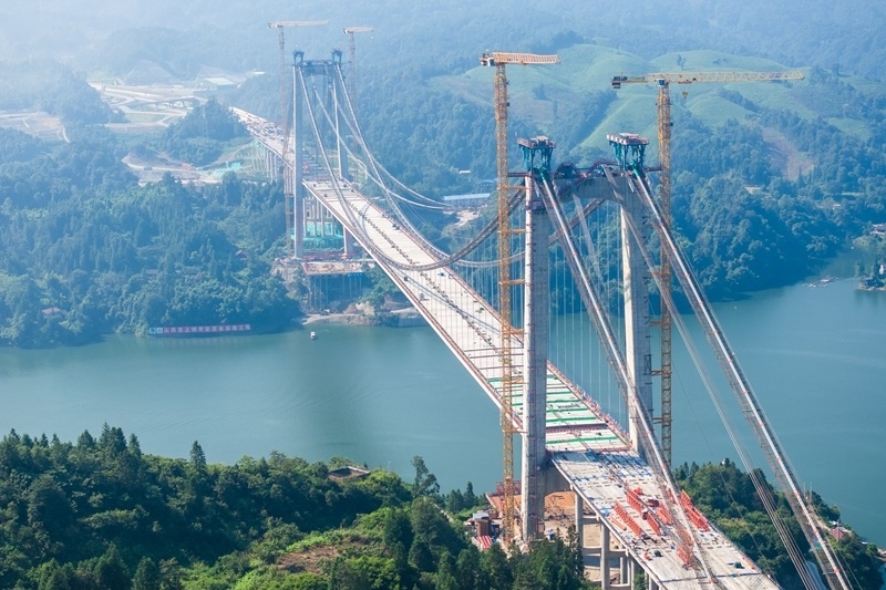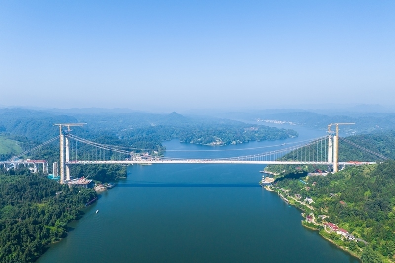 這是8月3日在懷化市沅陵縣拍攝的施工中的張官高速洞庭溪沅水特大橋(無人機照片)。
