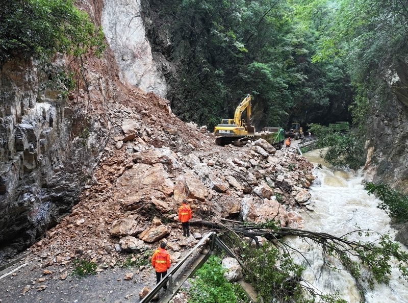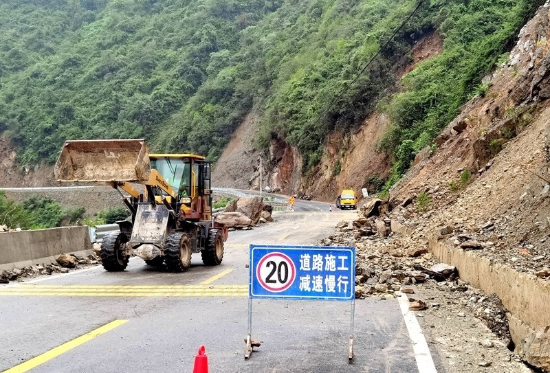 8月10日,在468省道??悼h寺坪鎮(zhèn)升石坪路段,公路養(yǎng)護(hù)部門工作人員駕駛裝載機(jī)處置路旁垮方。