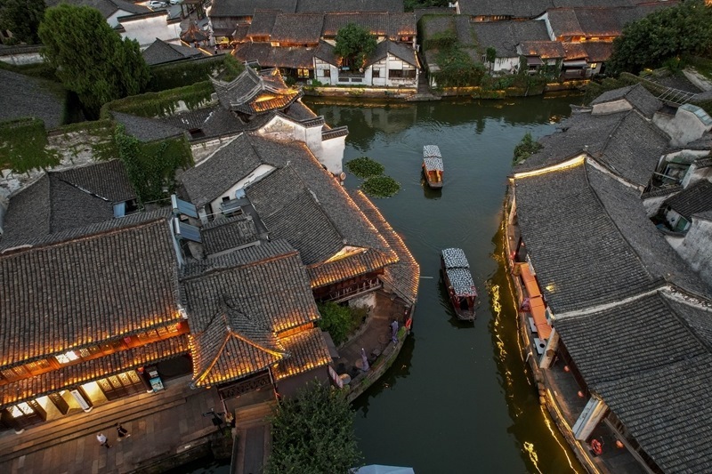 8月9日傍晚,游客在浙江省湖州市德清縣新市古鎮(zhèn)游玩(無人機(jī)照片)。