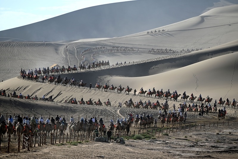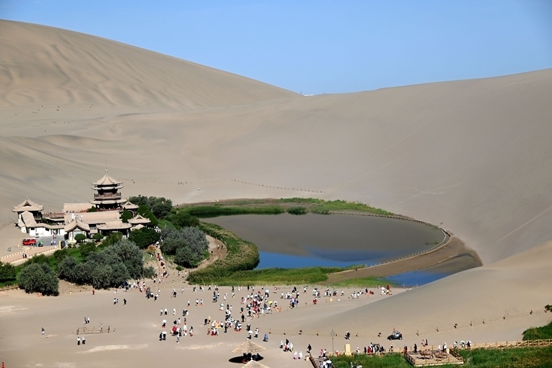8月9日,游客在甘肅省敦煌市鳴沙山月牙泉景區(qū)游覽。