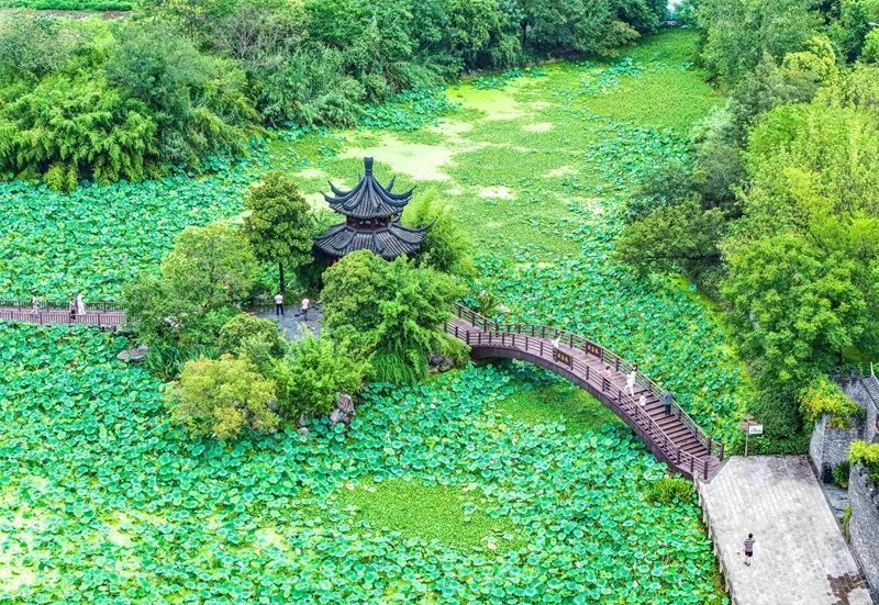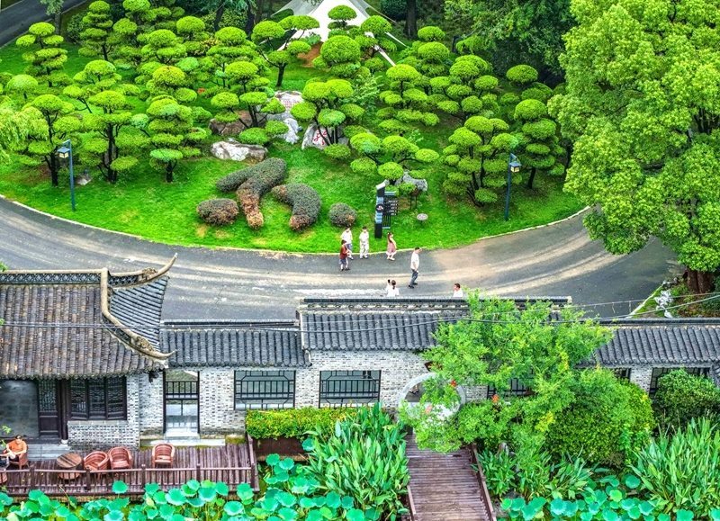 8月10日,游客在江蘇省揚(yáng)州市江都區(qū)丁伙鎮(zhèn)樸園游玩(無人機(jī)照片)。