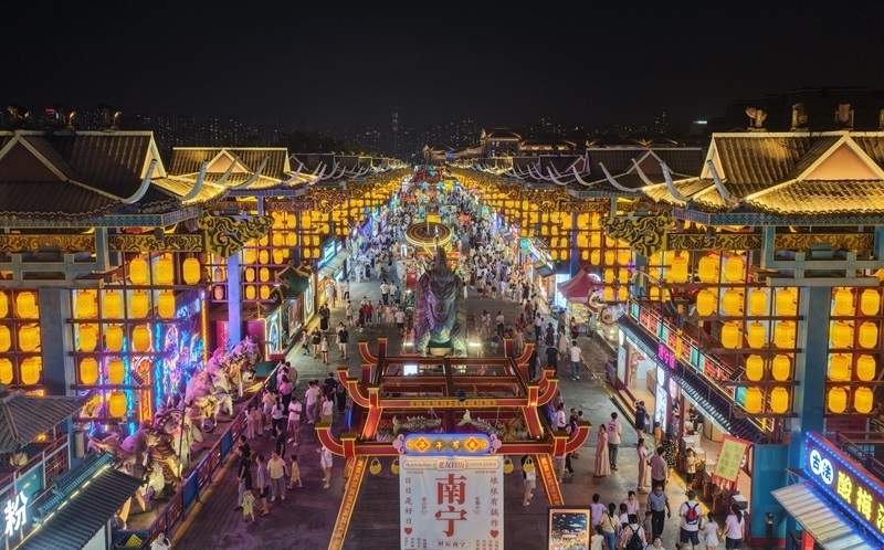 8月9日,在廣西南寧市“南寧之夜”街區(qū),游客逛夜市(無人機(jī)照片)。