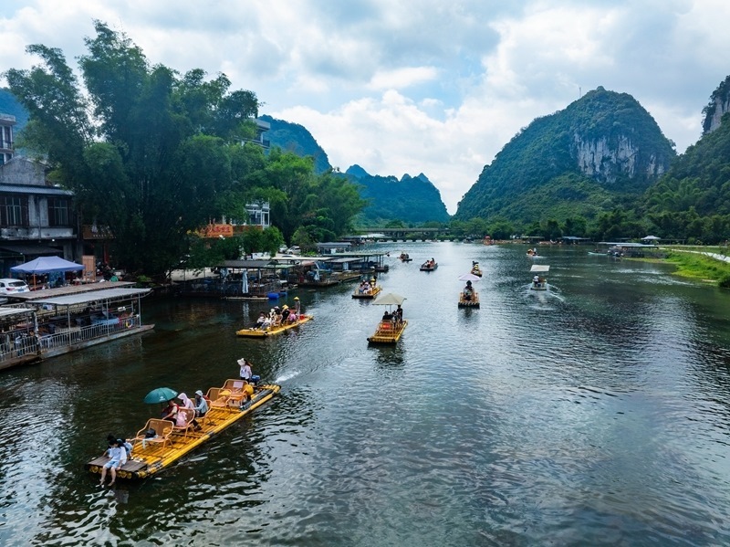 8月10日,在漓江廣西桂林市陽朔縣興坪鎮(zhèn)段,游客乘竹筏游玩賞景(無人機(jī)照片)。