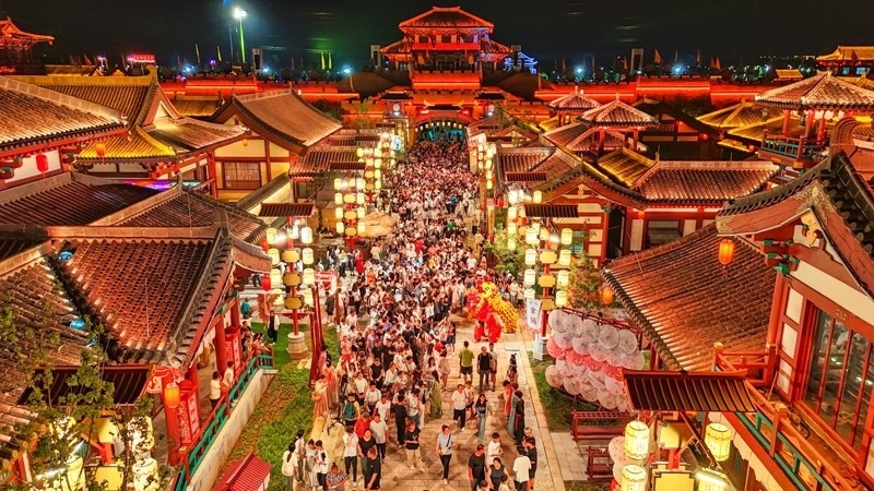 8月9日,山東樂陵影視城景區(qū)流光溢彩、游人如織(無人機(jī)照片)。