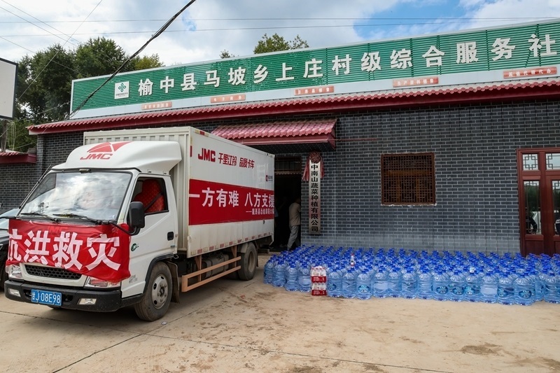 8月10日,一輛載著救援物資的車輛停靠在榆中縣馬坡鄉(xiāng)上莊村臨時(shí)安置點(diǎn)。