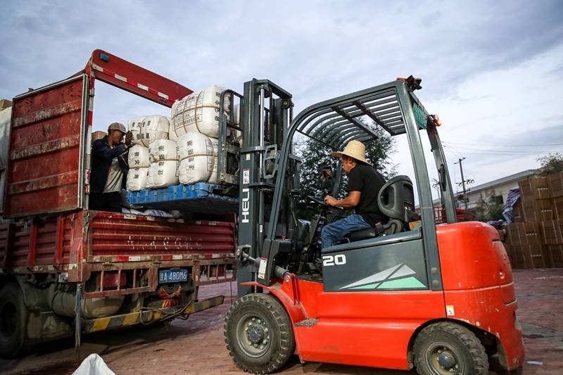 8月10日,在榆中縣救災(zāi)物資儲(chǔ)備服務(wù)中心,工作人員將救災(zāi)物資裝車。