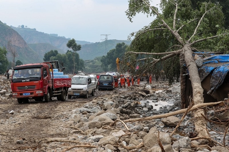 8月9日,在榆中縣馬坡鄉(xiāng)馬蓮灘村,救災(zāi)車輛行駛在路上。