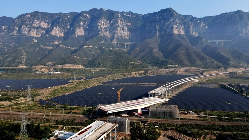 這是8月11日拍攝的河南省濟源市沿太行山高速公路跨焦柳鐵路立交橋轉(zhuǎn)體施工現(xiàn)場。