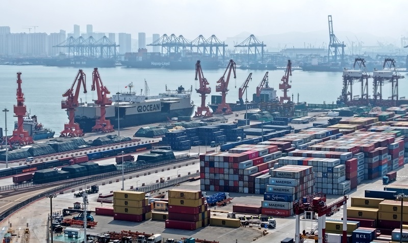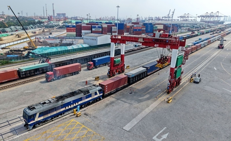 這是8月19日拍攝的山東港口青島港前灣港區(qū)海鐵聯(lián)運(yùn)中心堆場(無人機(jī)照片)。