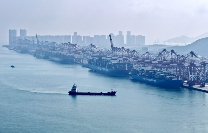8月19日,貨輪在山東港口青島港前灣港區(qū)裝卸集裝箱(無人機(jī)照片)。