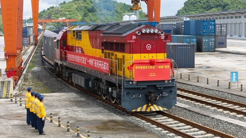 8月19日,貴州首趟多式聯(lián)運“一單制”班列駛出貴陽國際陸港都拉營站(無人機照片)。