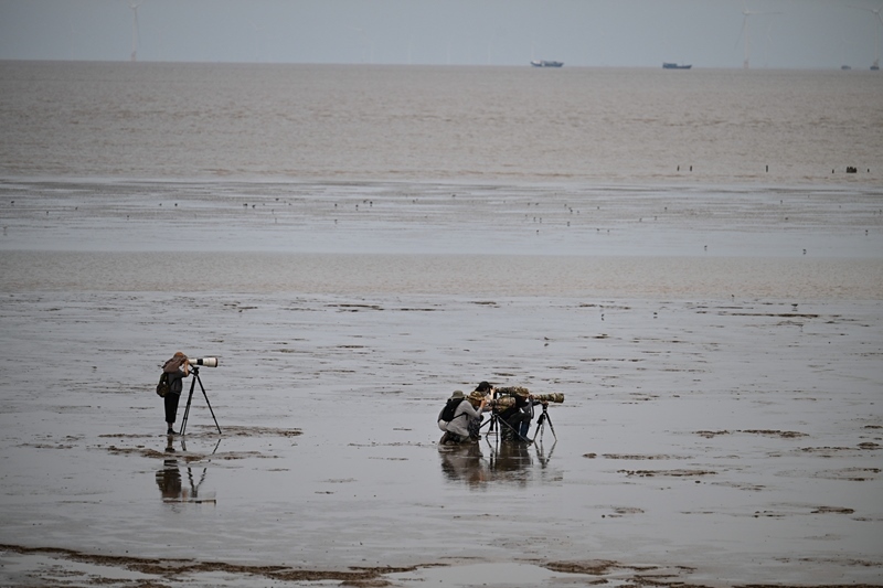 8月25日,攝影愛好者在東臺(tái)條子泥濕地拍鳥。