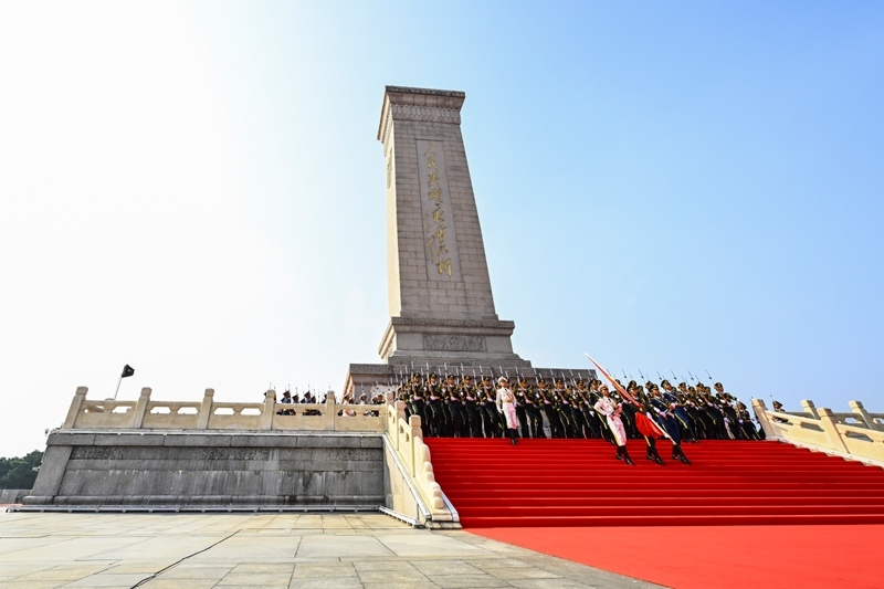 9月3日,紀念中國人民抗日戰(zhàn)爭暨世界反法西斯戰(zhàn)爭勝利80周年大會在北京隆重舉行。這是國旗護衛(wèi)隊從人民英雄紀念碑基座出發(fā),走向旗桿基座。