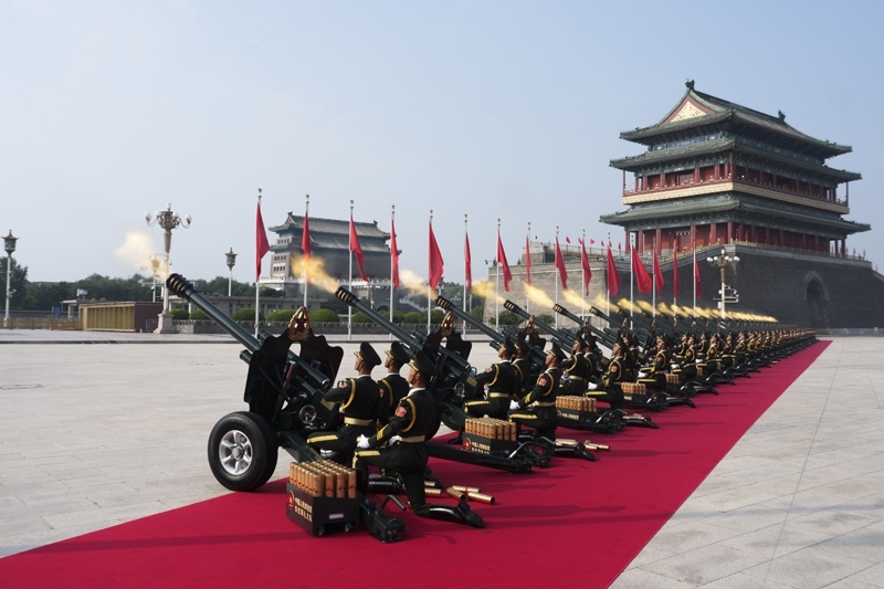 9月3日,紀念中國人民抗日戰(zhàn)爭暨世界反法西斯戰(zhàn)爭勝利80周年大會在北京隆重舉行。這是禮炮在天安門廣場鳴響。