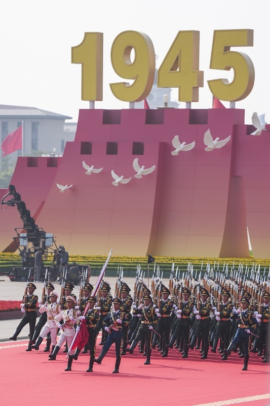 9月3日,紀念中國人民抗日戰(zhàn)爭暨世界反法西斯戰(zhàn)爭勝利80周年大會在北京隆重舉行。這是國旗護衛(wèi)隊在行進中。