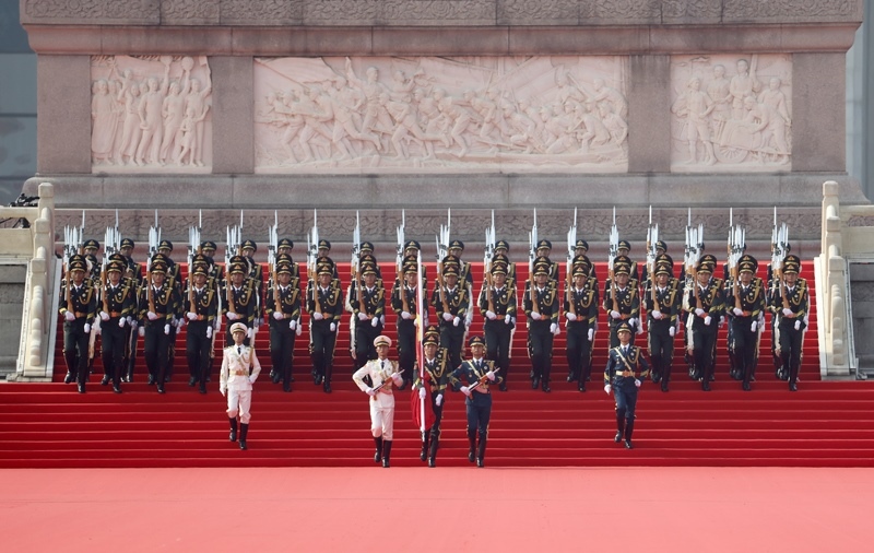 9月3日,紀念中國人民抗日戰(zhàn)爭暨世界反法西斯戰(zhàn)爭勝利80周年大會在北京隆重舉行。這是國旗護衛(wèi)隊從人民英雄紀念碑基座出發(fā),走向旗桿基座。