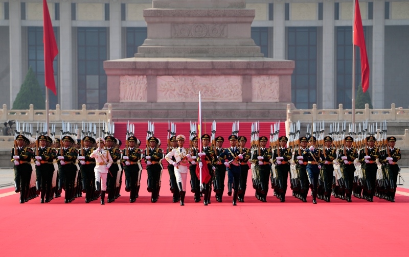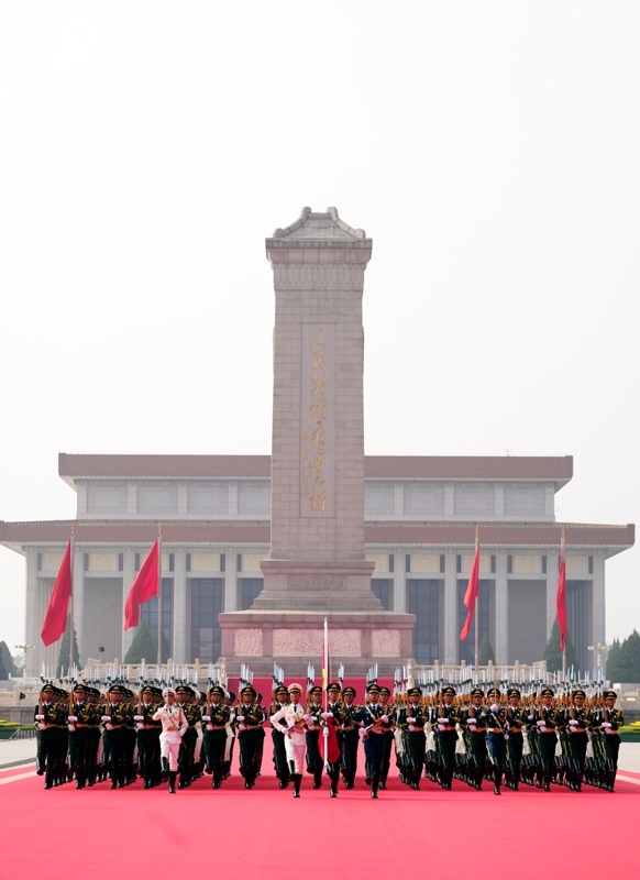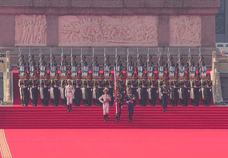 9月3日,紀(jì)念中國(guó)人民抗日戰(zhàn)爭(zhēng)暨世界反法西斯戰(zhàn)爭(zhēng)勝利80周年大會(huì)在北京隆重舉行。這是國(guó)旗護(hù)衛(wèi)隊(duì)官兵護(hù)衛(wèi)著五星紅旗,從人民英雄紀(jì)念碑行進(jìn)至廣場(chǎng)北側(cè)升旗區(qū)。