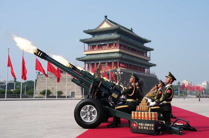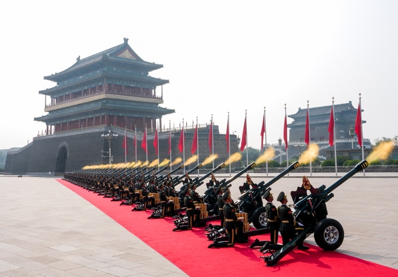 9月3日,紀(jì)念中國(guó)人民抗日戰(zhàn)爭(zhēng)暨世界反法西斯戰(zhàn)爭(zhēng)勝利80周年大會(huì)在北京隆重舉行。這是禮炮在天安門(mén)廣場(chǎng)鳴響。