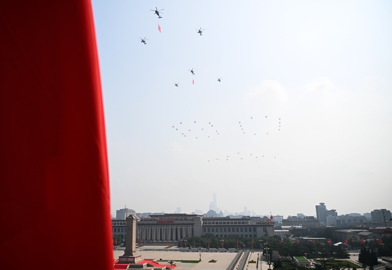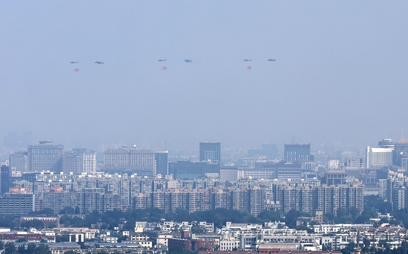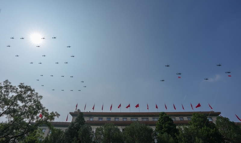 9月3日,紀(jì)念中國(guó)人民抗日戰(zhàn)爭(zhēng)暨世界反法西斯戰(zhàn)爭(zhēng)勝利80周年大會(huì)在北京隆重舉行。這是空中護(hù)旗梯隊(duì)飛過(guò)天安門廣場(chǎng)上空,26架直升機(jī)匯成巨大的“80”字樣。