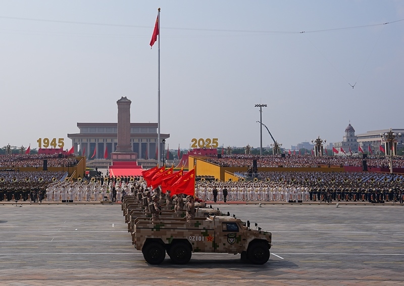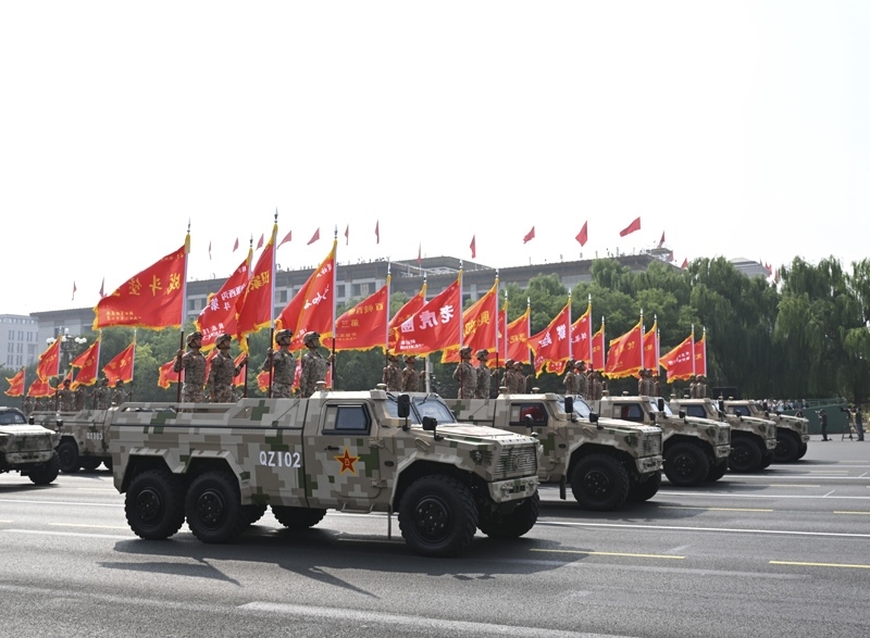 9月3日,紀(jì)念中國人民抗日戰(zhàn)爭暨世界反法西斯戰(zhàn)爭勝利80周年大會在北京隆重舉行。這是戰(zhàn)旗方隊(duì)接受檢閱。