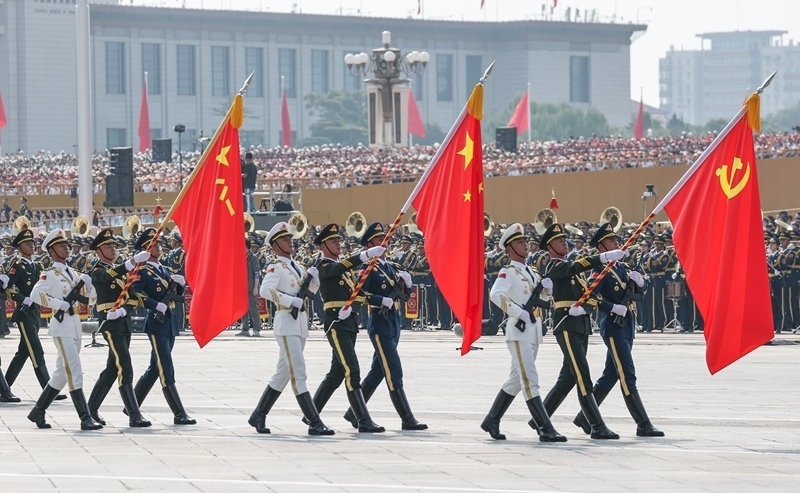 9月3日,紀念中國人民抗日戰(zhàn)爭暨世界反法西斯戰(zhàn)爭勝利80周年大會在北京隆重舉行。這是戰(zhàn)旗方隊接受檢閱。