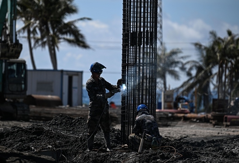 9月5日,工人在海南商業(yè)航天發(fā)射場二期項目四號發(fā)射工位施工。