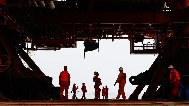 9月8日,工人在墾利6-1油田10-1北區(qū)塊Ⅱ期開發(fā)項目油氣平臺安裝作業(yè)現(xiàn)場施工。