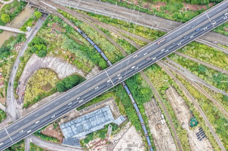 9月8日,滿載“重慶造”汽車的中歐班列(成渝)在重慶團(tuán)結(jié)村中心站順利發(fā)車(無(wú)人機(jī)照片)。