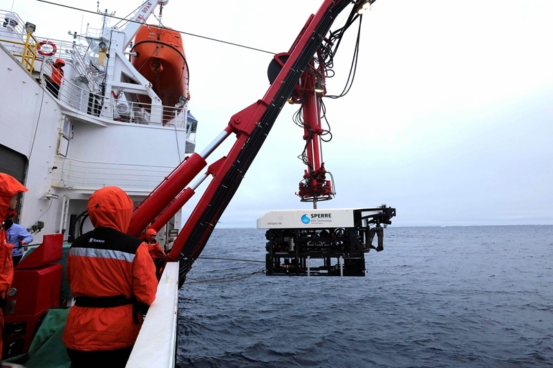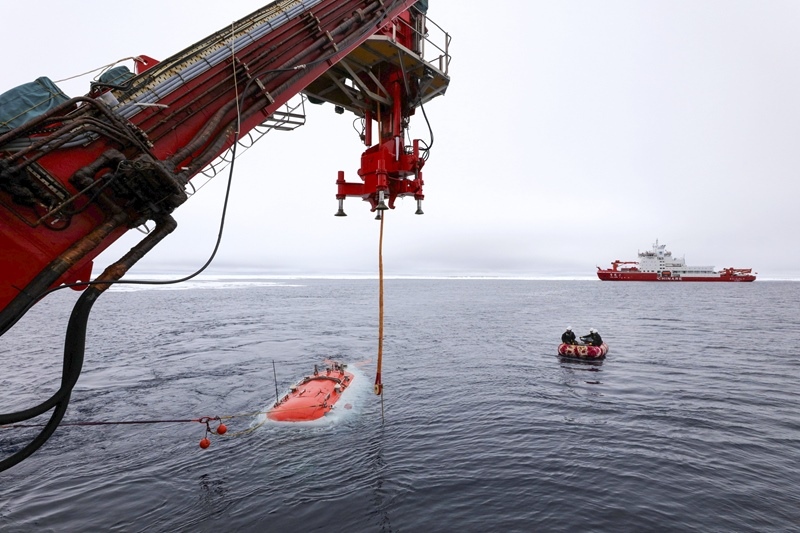 8月7日,科考隊(duì)員將ROV(無人遙控潛水器)放入水中。