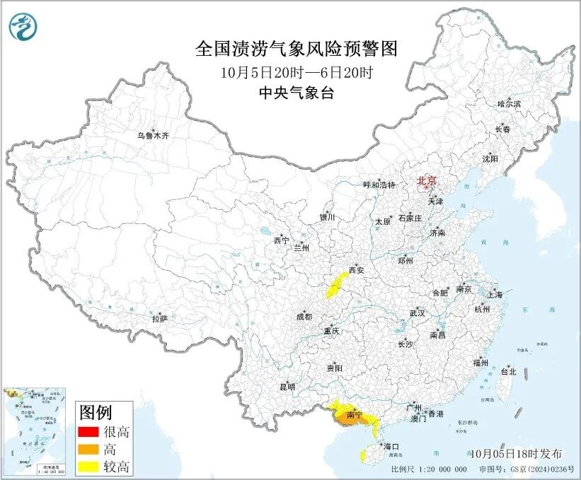 中央氣象臺(tái)10月5日18時(shí)發(fā)布漬澇風(fēng)險(xiǎn)氣象預(yù)報(bào):受強(qiáng)降雨的影響,預(yù)計(jì)10月5日20時(shí)至6日20時(shí),廣東西南部、廣西南部和西部、海南西部、四川東北部、陜西西部等地部分地區(qū)發(fā)生漬澇的氣象風(fēng)險(xiǎn)較高,其中,廣西南部等地部分地區(qū)發(fā)生漬澇的氣象風(fēng)險(xiǎn)高,易形成城市內(nèi)澇和農(nóng)田漬害,需加強(qiáng)防范。