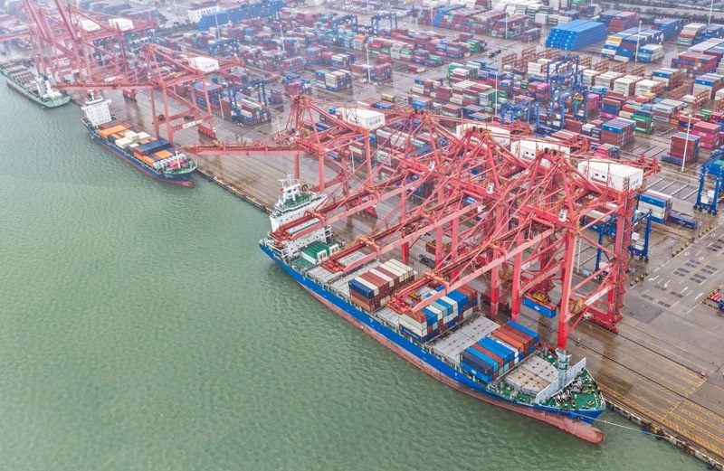 10月13日,在江蘇省連云港港集裝箱碼頭,貨輪在裝載出口貨物(無人機照片)。