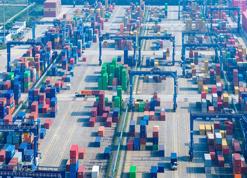10月13日在山東港口青島港拍攝的外貿(mào)集裝箱碼頭(無人機照片)。