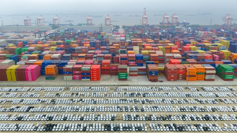 10月13日在江蘇省港口集團南京港龍?zhí)陡蹍^(qū)拍攝的準備裝船出口的汽車(無人機照片)。