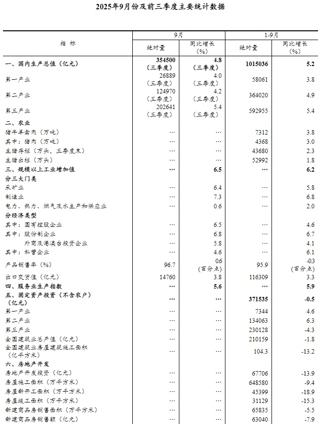 初步核算,前三季度國內(nèi)生產(chǎn)總值1015036億元,按不變價格計算,同比增長5.2%。分產(chǎn)業(yè)看,第一產(chǎn)業(yè)增加值58061億元,同比增長3.8%;第二產(chǎn)業(yè)增加值364020億元,增長4.9%;第三產(chǎn)業(yè)增加值592955億元,增長5.4%。分季度看,一季度國內(nèi)生產(chǎn)總值同比增長5.4%,二季度增長5.2%,三季度增長4.8%。從環(huán)比看,三季度國內(nèi)生產(chǎn)總值增長1.1%。