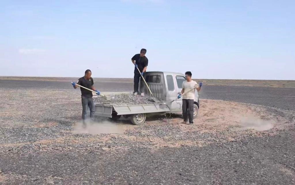 “看到車輪碾過標語那一刻,就像碾在歷史的脊梁上?!本W(wǎng)絡博主陸遙得知標語被破壞后,主動驅(qū)車兩千多公里,經(jīng)歷六天抵達哈密。他和朋友們拉運20噸砂石,才終于修復這些“疤痕”。