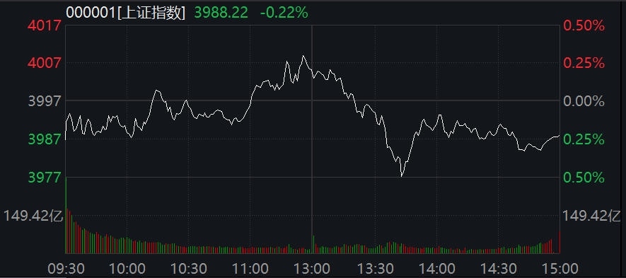 截至收盤,滬指跌0.22%,報(bào)3988.22點(diǎn);深成指跌0.44%,報(bào)13430.1點(diǎn);創(chuàng)業(yè)板指跌0.15%,報(bào)3229.58點(diǎn)。兩市合計(jì)成交21479億元,較上個(gè)交易日縮量約2000億元。