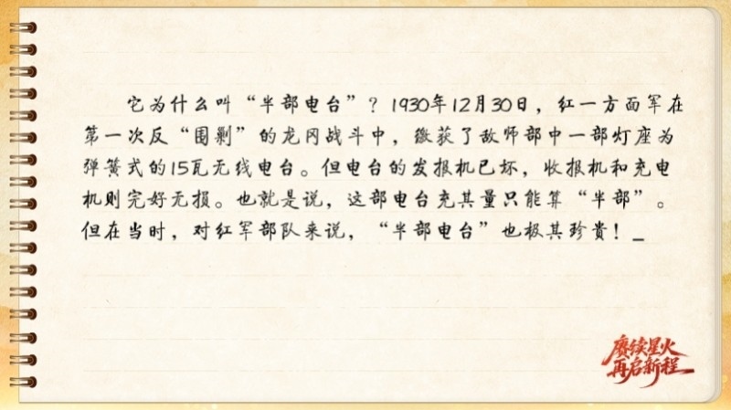 它為什么叫“半部電臺”?1930年12月30日,紅一方面軍在第一次反“圍剿”的龍岡戰(zhàn)斗中,繳獲了敵師部中一部燈座為彈簧式的15瓦無線電臺。但電臺的發(fā)報機已壞,收報機和充電機則完好無損。也就是說,這部電臺充其量只能算“半部”。但在當時,對紅軍部隊來說,“半部電臺”也極其珍貴!