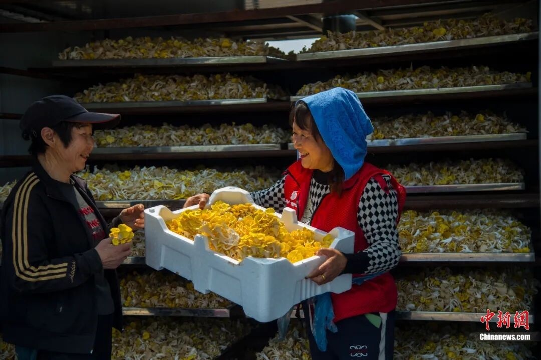 (菌菇烘干房內(nèi),菌農(nóng)正在勞作。黃松甸鎮(zhèn)供圖)