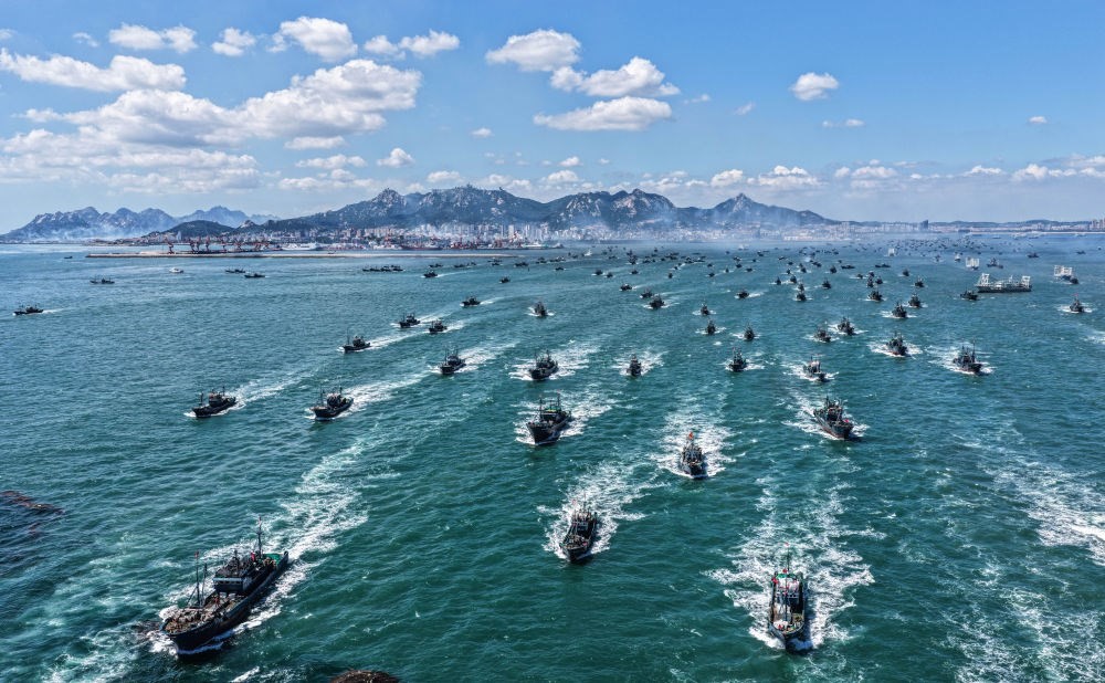 ↑ 在山東省榮成市石島漁港,黃渤海休漁期結(jié)束后,漁民駕駛漁船出海作業(yè)(9月1日攝,無人機照片)。新華社發(fā)(李信君 攝)