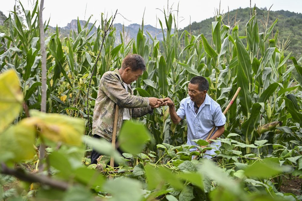 ↑村民元有才(右)為秦海松準(zhǔn)備好午餐后,兩人開(kāi)心交流(2025年8月6日攝)。
