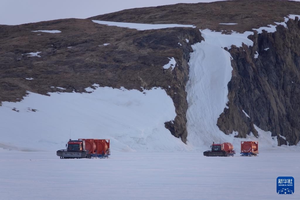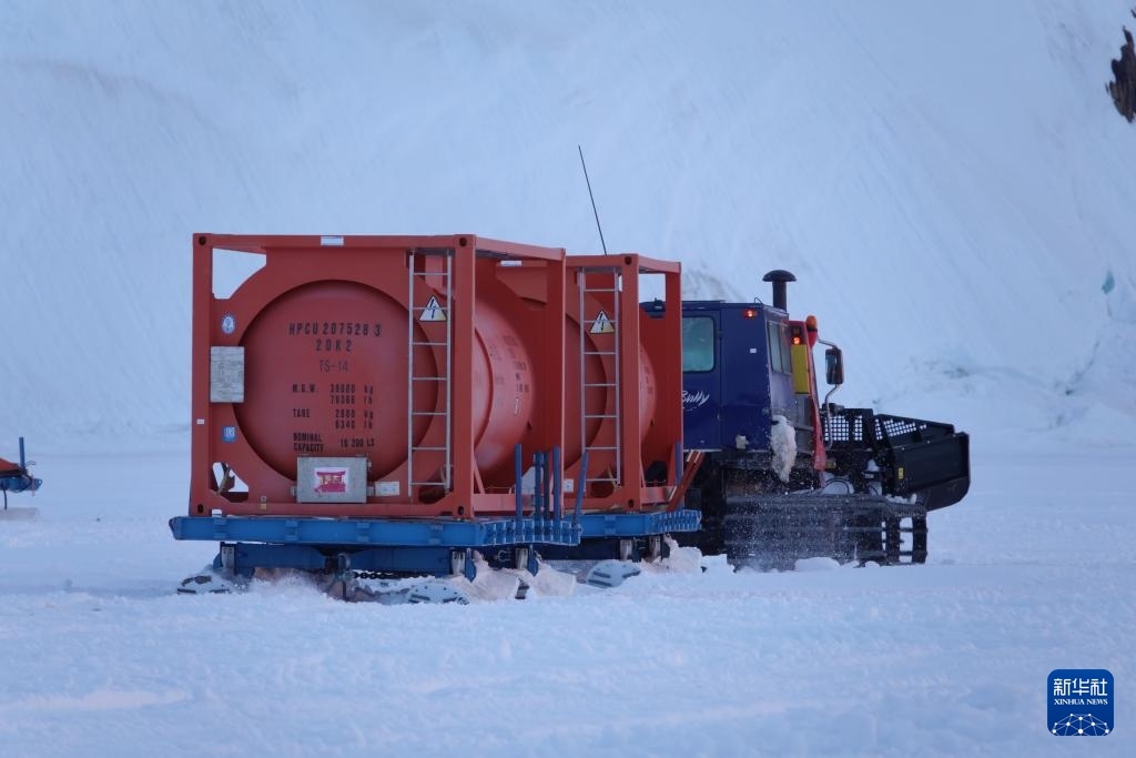 北京時間12月3日凌晨,雪地車拉著加滿燃油的油罐離開“雪龍2”號,駛向中山站。新華社記者 顧天成 攝