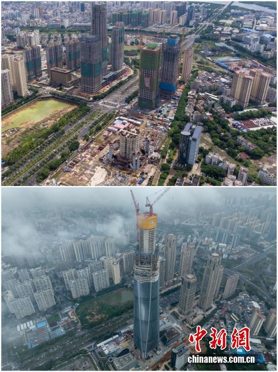 2025年12月18日,海南自由貿(mào)易港正式啟動(dòng)全島封關(guān)。近年來,海南自貿(mào)港建設(shè)在利好政策帶動(dòng)下不斷刷新“自貿(mào)港速度”,一個(gè)個(gè)重大項(xiàng)目、重點(diǎn)園區(qū)拔地而起,直觀呈現(xiàn)海南自貿(mào)港的蓬勃生機(jī)。這里正成為中國(guó)對(duì)外開放的新前沿、互利合作的新熱土和推動(dòng)經(jīng)濟(jì)全球化的新引擎。上資料圖為2020年8月21日因故停工的“海南第一高樓”海南中心項(xiàng)目,下資料圖為2025年12月16日海南中心項(xiàng)目順利完成塔樓核心筒結(jié)構(gòu)封頂。(拼版圖,無人機(jī)照片)