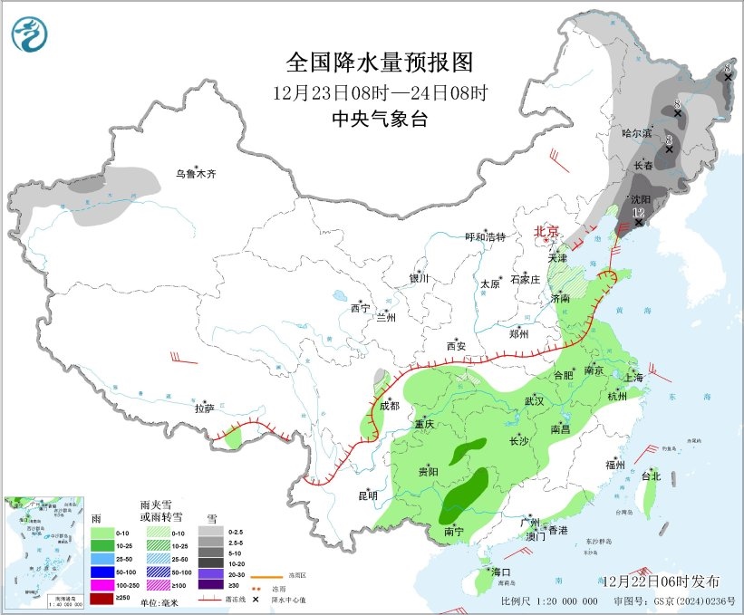 12月23日08時至24日08時,東北地區(qū)、新疆南疆西部山區(qū)、華北東部、山東北部等地部分地區(qū)有小到中雪或雨夾雪,其中,黑龍江中東部、吉林中部、遼寧東部局地大到暴雪(10~12毫米)。黃淮東部、江淮、江漢大部、江南北部和西部、西南地區(qū)東部、廣西、廣東東南部沿海、海南島東部、臺灣島東部等地部分地區(qū)有小雨,其中,湖南西部、貴州東北部、廣西中部等地部分地區(qū)有中雨。內(nèi)蒙古中東部、遼東半島、西藏中北部等地部分地區(qū)有4~6級風(fēng);渤海、渤海海峽、黃海大部海域、東海西部海域、臺灣海峽、巴士海峽、南海北部海域?qū)⒂?~7級大風(fēng)、陣風(fēng)8~9級。