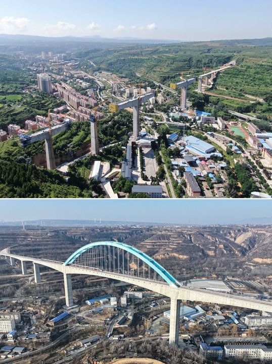 拼版照片:上圖為施工中的西延高鐵王家河特大橋(2023年7月22日攝,無(wú)人機(jī)照片);下圖為一列試運(yùn)行列車(chē)從西延高鐵王家河特大橋駛過(guò)(2025年12月10日攝,無(wú)人照片)。新華社記者 張博文 攝