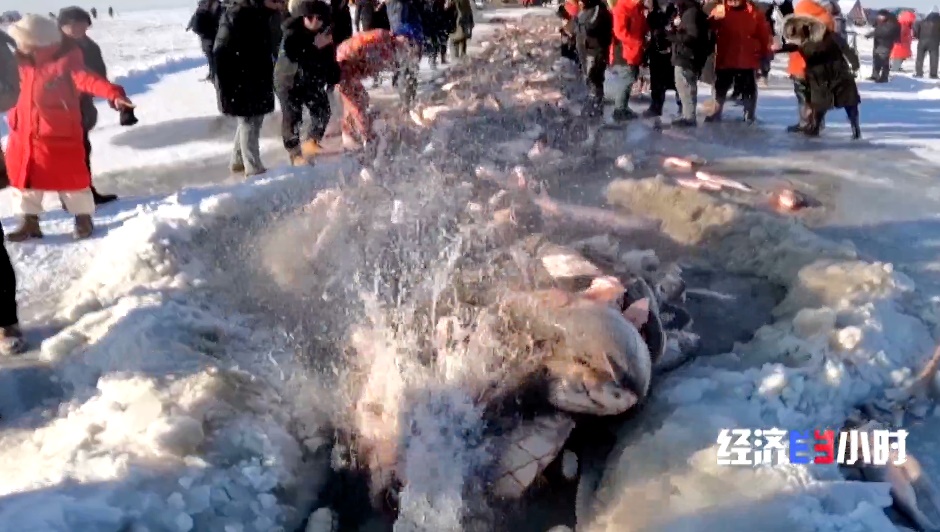 為了吸引游客,查干湖還推出私人訂制捕魚、冰下盲盒等新項(xiàng)目。100米長的掛網(wǎng),游客組隊(duì)拉拽,親手捕魚后,可以直接送進(jìn)后廚做成鐵鍋燉。